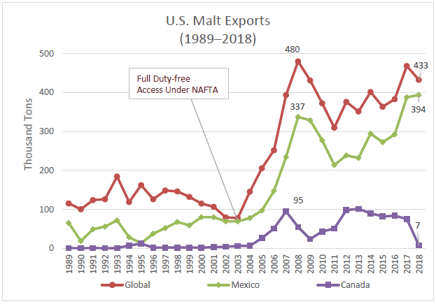 За немногими исключениями с 1989 года Мексика остается главным экспортным рынком для солода США. Мексиканские пивовары всех масштабов — как традиционные пивоваренные компании, так и развивающиеся независимые крафтовые пивовары — в значительной степени полагаются на американский солод за его качество и географическую близость. В 2003 году Мексика полностью отменила тарифы на солод и ячмень из США в соответствии со своими обязательствами по Североамериканскому соглашению о свободной торговле (НАФТА). В соответствии с Соглашением между Соединенными Штатами, Мексикой и Канадой были установлены нулевые тарифы на экспорт солода из США в Мексику, помогая поддерживать доступ к рынку и не допускать конкурентов США (например, Канаду, Европейский Союз и Россию) к борьбе за долю на рынке.