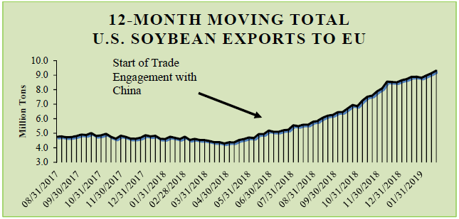Согласно 12-месячной скользящей общей сумме, основанной на данных, полученных из отчетов экспортных продаж FAS, экспорт сои в ЕС составляет более 9,0 млн. тонн на конец февраля. Это примерно вдвое больше, чем было экспортировано на конец февраля 2018 года. Последний раз, когда 12-месячный экспорт американской сои в ЕС достиг этого уровня, имел место в 1995 году.
