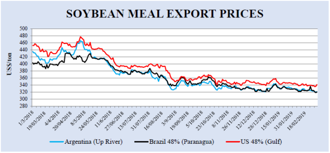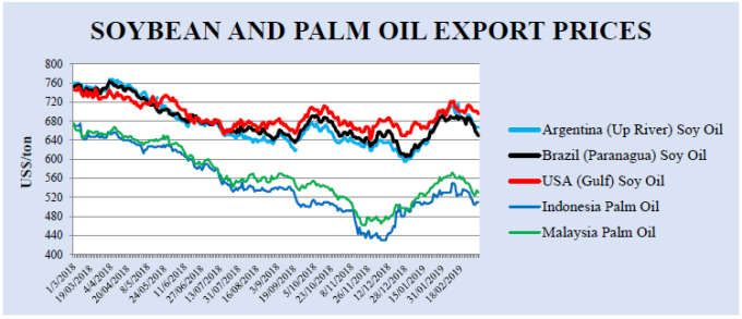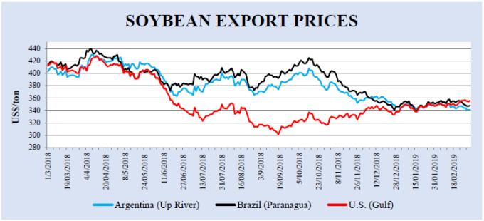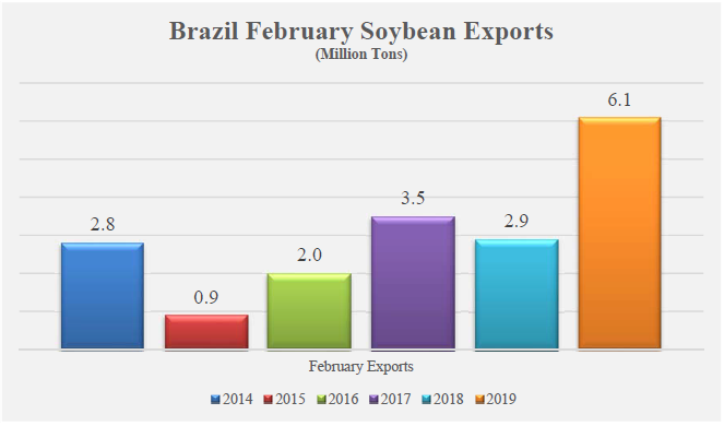 В феврале 2019 года экспорт бразильской сои достиг рекордных 6,1 млн. тонн, что более чем вдвое превышает уровень, наблюдавшийся в феврале 2018 года. Это связано с ранним сбором урожая и высоким спросом, главным образом из Китая. Несмотря на сохраняющуюся 25-процентную пошлину на американские соевые бобы в Китае, ценовая разница, которой пользовались бразильские производители в прошлом году, исчезла. Для коммерческих покупателей в Китае текущие цены являются значительным улучшением по сравнению с тем, что наблюдалось 6 месяцами ранее, и, вероятно, будут способствовать высокому спросу. Кроме того, сокращение запасов на 14 млн. тонн в результате уменьшения ожидаемого урожая и ограниченного объема переходящих остатков с прошлого сезона лишь увеличило спрос.