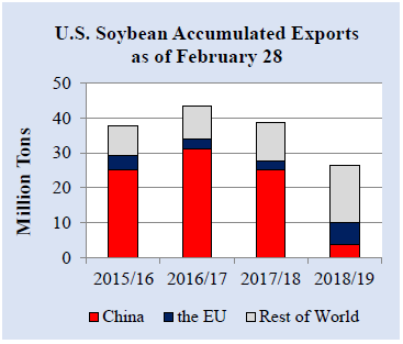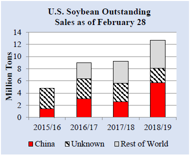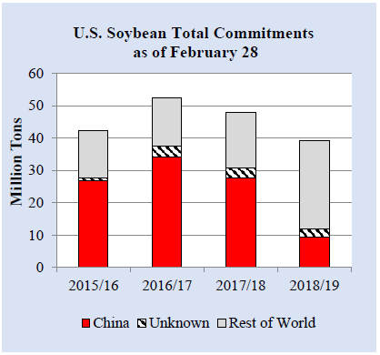 За неделю, закончившуюся 28 февраля 2019 года, обязательства США по экспорту сои в 2018/19 году (отсроченные продажи плюс накопленный экспорт) в Китай составили 9,4 млн. тонн по сравнению с 27,7 млн. годом ранее. Общий объем обязательств перед миром составил 39,3 млн. тонн против 48,0 млн. за аналогичный период прошлого года. Накопленный экспорт сои составил 26,6 млн. тонн, что почти на треть ниже, чем за аналогичный период прошлого года. Накопленный экспорт сои в Китай составил 3,7 млн. тонн, что на 21,5 млн. тонн меньше, чем в прошлом году. Поставки в остальные страны составили 22,9 млн. тонн, что на 9,3 млн. тонн выше, чем в прошлом году за тот же период.