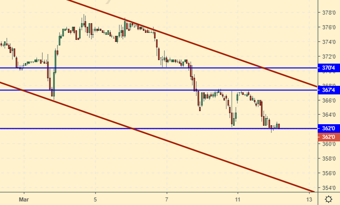 Кукуруза: цены у локальных минимумов. Ход ниже 360.0 приведет к движению на 330.0. Предпосылок для разворота вверх никаких нет. При возврате к 365.0 можно нарастить шорты. Продавцы не забывают поджимать стоп-ордера.