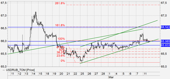 Рубль: пока мы выше 65.50 говорить об укреплении рубля преждевременно. Видим, что растущая нефть не допускает сильных прорывов вверх. Текущие уровни с гарантией перекрывают все потребности бюджета на этот, да и на следующий год, поэтому, именно фундаментальных экономических угроз для рубля сейчас нет. Проход ниже 65.90 приведет к выходу из растущего канала, что может вылиться в ход на 65.50, а возможно и ниже. Покупателям долларов имеет смысл подтянуть стоп-ордера.