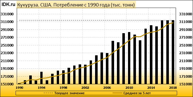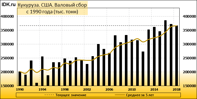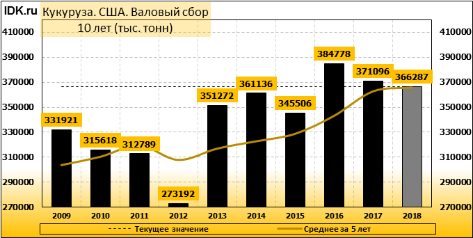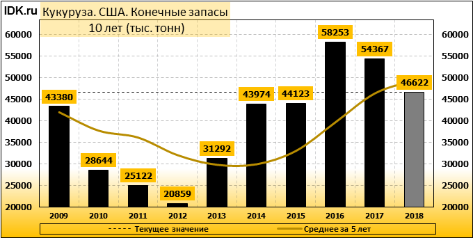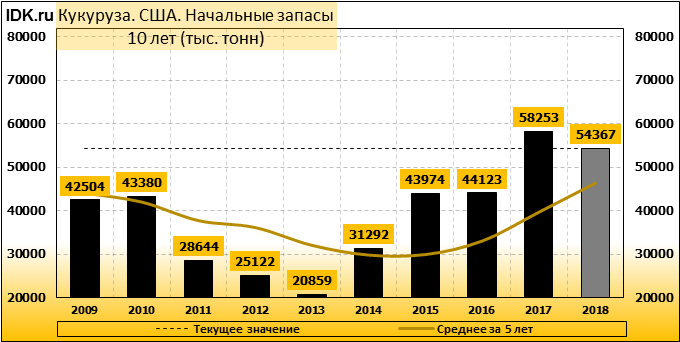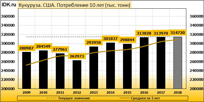 Прогноз по кукурузе для США на 2018/19 год в этом месяце включает сокращение использования кукурузы в качестве этанола, сокращение экспорта и увеличение остатков. Использование кукурузы для производства этанола снизилось на 25 миллионов бушелей до 5,550 миллиарда. Экспорт сокращен на 75 миллионов бушелей до 2,375 миллиарда, что отражает снижение ценовой конкурентоспособности США и ожидания увеличения экспорта для Бразилии и Аргентины. При отсутствии других изменений в использовании конечные запасы повышены на 100 миллионов бушелей до 1,835 миллиарда.