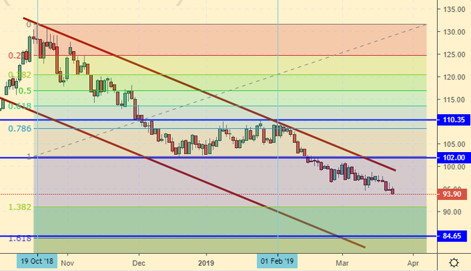 Сценарий роста: рассматриваем майский фьючерс, дата экспирации 20 мая. Пока мы правы в своем видении: рынок идет в район 85.00. От 85.00 можно встречать хорошими покупками. Возврат к 100.0, после касания 85.00, выглядит вполне возможным.