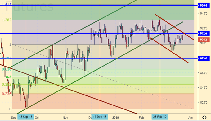 Сценарий роста: рассматриваем майский фьючерс, дата экспирации 14 мая. Продолжаем считать, что возврат к 920.0 это максимум на что способен рынок. Более того, как видим, возникла угроза формирования пусть и локальной «двойной вершины». В случае падения ниже 895.0 рынок отправится на 880.0. Будем покупать только после роста выше 920.0.