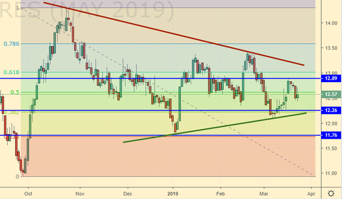 Сценарий роста: рассматриваем майский фьючерс, дата экспирации 30 апреля. Видим консолидацию. В большинстве случаев выход из неё осуществляется по более старшему тренду, в данном случае это вверх. В случае роста выше 13.30 будем покупать.