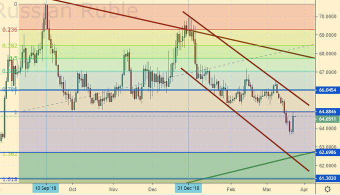 До конца следующей недели экспортеры будут продавать валюту. Это поддержит рубль и вряд ли мы окажемся выше 66.00 даже если Brent станет уходить от 68.00 в сторону 60.00. С другой стороны, похоже закончилась история с неким покупателем (покупателями) ОФЗ, который за последние две недели выбрал облигаций примерно на 50 млрд. рублей. Результаты аукционов по ОФЗ несколько смутили аналитиков (в частности Райффайзенбанка), так как серьезной борьбы на них не было. Аукцион в большей степени походил на некое соглашение между Минфином и покупателем проведенное через аукцион. Следующая неделя – последний шанс на то чтобы рубль показал максимум года. В апреле и далее национальную валюту ничего хорошего не ждет. Можно вспомнить и продолжающийся отток капитала и дивидендные выплаты, которые будут уже летом.