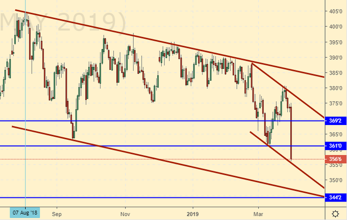 Сценарий роста: рассматриваем майский фьючерс, дата экспирации 14 мая. Вот что происходит когда площади под посев культуры вырастают в США на 4%. Свечка гигантская да еще и закрылась у минимума. Не покупаем.