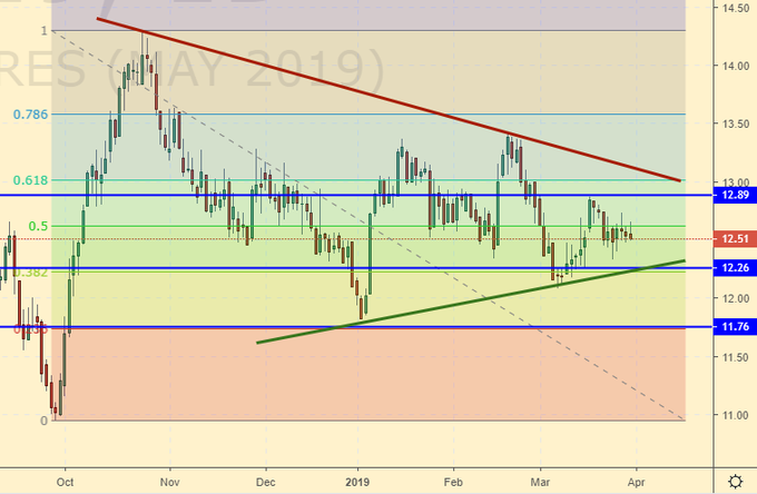 Сценарий роста: рассматриваем майский фьючерс, дата экспирации 30 апреля. Продолжаем находиться в консолидации. Вновь отмечаем, что в большинстве случаев выход из неё осуществляется по более старшему тренду, в данном случае это вверх. В случае роста выше 13.10 будем покупать.