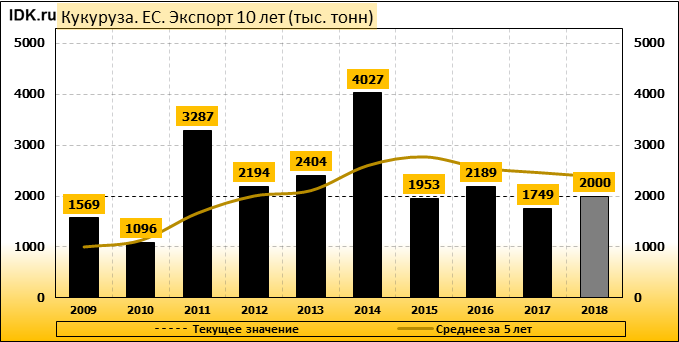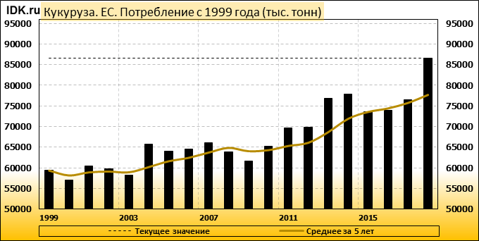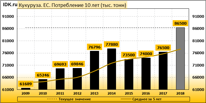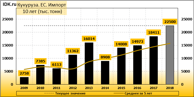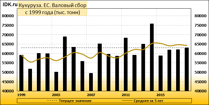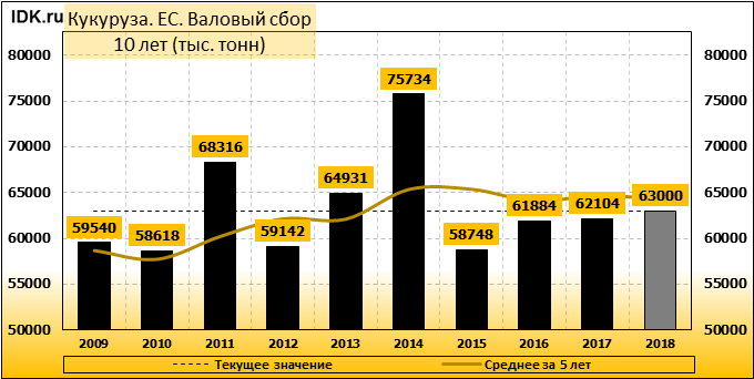 В новом отчете WASDE Министерства Сельского Хозяйства США прогнозируемый объем производства кукурузы в Европейском союзе в 2018/19 году значительно повышен на 2,125 млн. тонн до 63 млн. тонн, что на 0,9 млн. тонн или 1,44 процента больше по сравнению с прошлым годом. Увеличение прогноза произошло за счет повышения урожайности с 7,55 тонн на гектар до 7,62 т/га и увеличения площади с 8,07 до 8,26 миллиона гектаров. Прогноз импорта кукурузы в ЕС для 2018/19 года в этом месяце повышен на 1 млн. тонн до 22,5 млн. тонн на базе текущих быстрых темпов торговли. Прогноз экспорта увеличен на 500 тыс. тонн до 2 млн. тонн в связи с увеличением ожидаемого урожая.