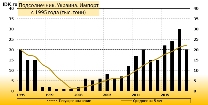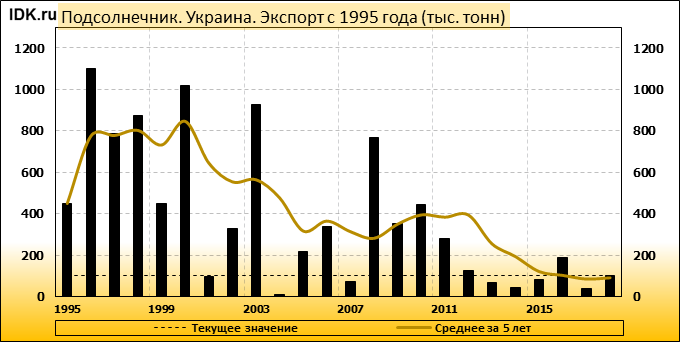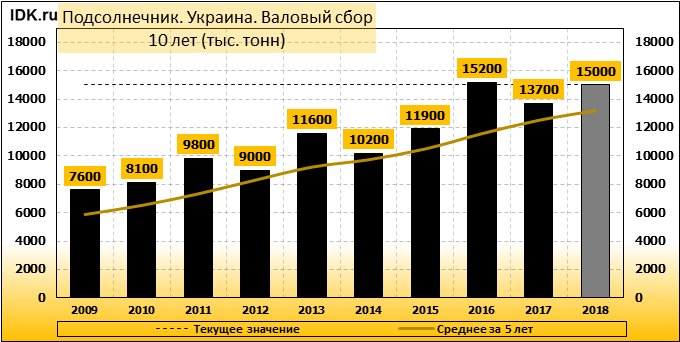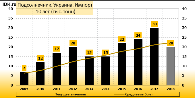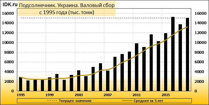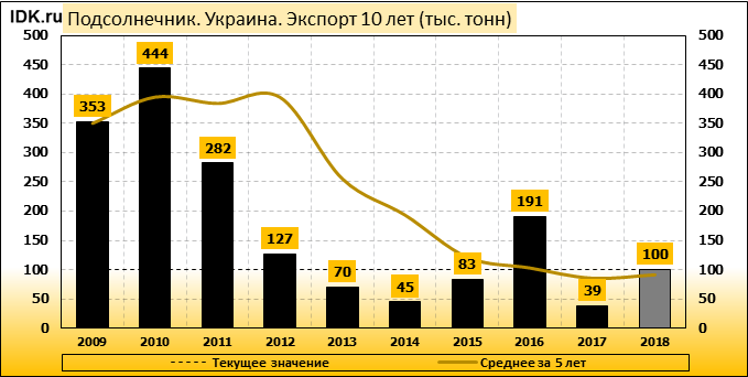 Министерство сельского хозяйства США в своем апрельском отчете прогнозирует, что производство подсолнечника в Украине в 2018/19 году составит 15,0 млн. тонн. Этот прогноз остался неизменным с марта и превышает оценку производства предыдущего года на 1,3 млн. тонн или 9,49 процента. Прогноз украинского экспорта подсолнечника на 2018/19 год составляет 100 тыс. тонн, подсолнечного масла — 5,6 млн. тонн, для сравнения оценка экспорта для 2017/18 года составляет 39 тыс. тонн и 5,341 млн. тонн соответственно.