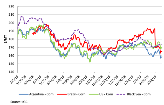 Южноамериканские цены снизились, отражая обильные экспортные запасы. Аргентинские цены упали на 3 доллара за тонну до 159 долларов, в то время как бразильские цены, отражающие улучшение перспектив для кукурузы второго урожая, снизились на 25 долларов за тонну до 165 долларов. Черноморские цены выросли на 2 долл. / т до 174 долл. на фоне роста спроса со стороны Европейского союза. Ставки в США упали всего на 3 долл. США / т до 170 долл. США, поскольку более крупные, чем ожидалось, намерения по посевам были большей частью компенсированы опасениями по поводу задержек посева и логистических сложностей, связанных с погодными условиями.