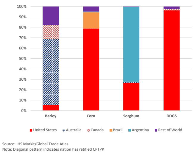 Кукуруза и сорго из США сталкиваются также с конкуренцией со стороны Бразилии и Аргентины, но они не являются участниками CPTPP. Соединенные Штаты являются крупнейшим в мире производителем и экспортером DDGS и доминируют в импорте Японии. Сравнительно небольшое производство в Канаде делает маловероятным удовлетворение им высокого спроса в Японии.