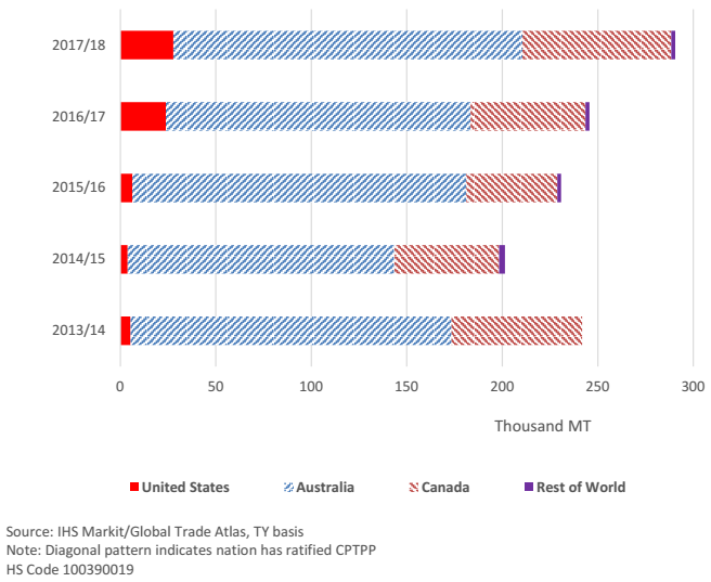Продовольственный ячмень из США в настоящее время составляет около 10 процентов импорта продовольственного ячменя Японии. Согласно официальным торговым данным Японии, средняя стоимость продовольственного ячменя из США на 60% выше, чем австралийского и канадского ячменя. CPTPP может представлять угрозу для экспорта продовольственного ячменя из США на этот нишевый рынок.
