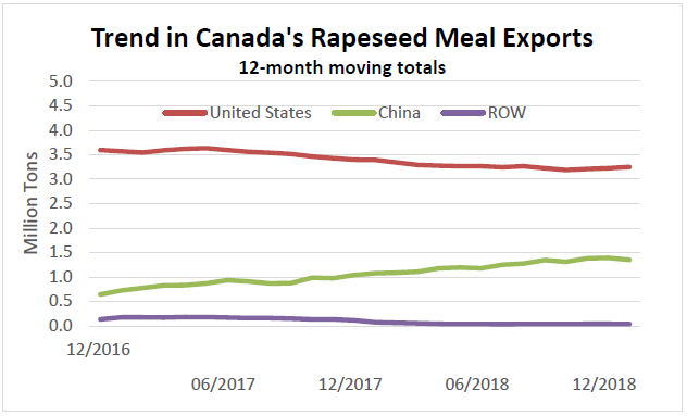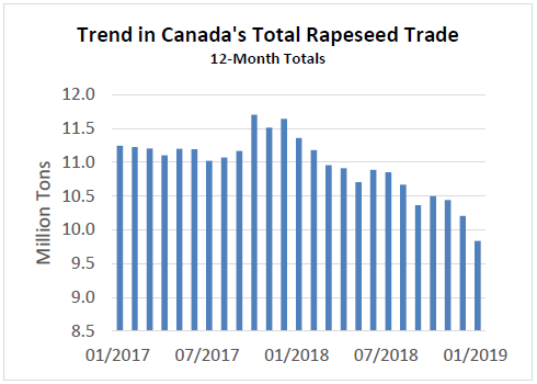 Прогноз по экспорту рапса из Канады на 2018/19 г. был сокращен на 1 млн. тонн в этом месяце в связи с замедлением темпов торговли и недавним торговым спором с Китаем. Теперь прогнозируется, что экспорт достигнет 10,6 млн. тонн, что немного ниже, чем в предыдущем году. Однако темпы экспорта должны будут ускориться по сравнению с прошлым годом, чтобы достичь текущего прогноза, поскольку экспорт за 12 месяцев, закончившихся в январе 2019 года, упал до уровня ниже 10 миллионов тонн. Чтобы достичь этого, Канаде может потребоваться быстрое разрешение текущего торгового спора, который ограничил доступ к рынку Китая для двух крупнейших экспортеров, Richardson International и Viterra, в ответ на утверждение Китая о том, что поставки не соответствовали стандартам качества в отношении запрещенных вредителей.