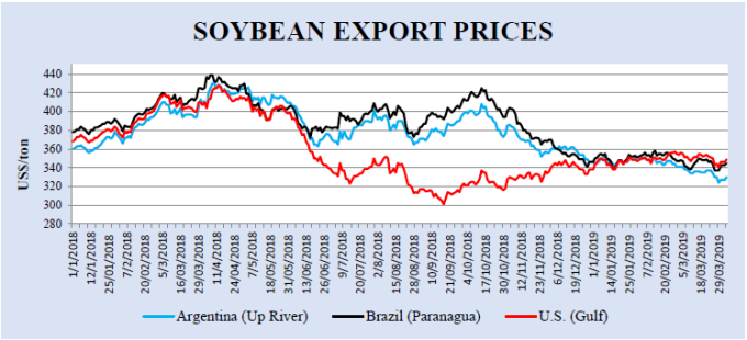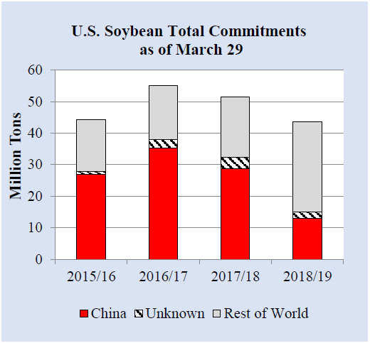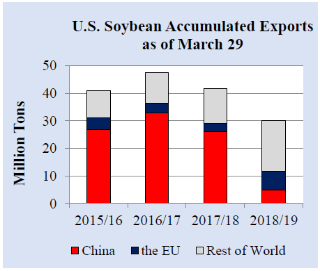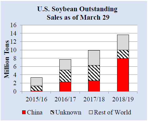 За неделю, закончившуюся 29 марта 2019 г., обязательства США по экспорту сои на 2018/19 г. (отсроченные продажи плюс накопленный экспорт) в Китай составили 12,9 млн. тонн против 28,7 млн. год назад. Общие обязательства перед миром составили 43,6 млн. тонн по сравнению с 51,5 млн. за аналогичный период прошлого года. Накопленный экспорт сои составил 30,0 млн. тонн, что на четверть ниже, чем за аналогичный период прошлого года. Накопленный экспорт сои в Китай составил 4,9 млн. тонн, что на 21 млн. тонн меньше, чем в прошлом году. Поставки в другие страны составили 25,1 млн. тонн, что на 9,5 млн. тонн больше, чем в прошлом году за тот же период.