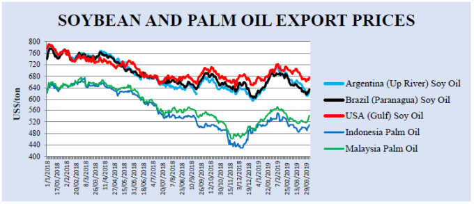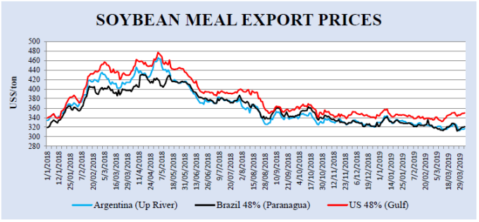 Экспортные цены на сою в США в марте, FOB Gulf, в среднем составляли 351 долл. / т, без изменений с февраля. Средняя цена Brazil Paranagua составила 344 доллара за тонну, что ниже уровня февраля на 9 долларов. Средняя цена Argentina Up River FOB составила 335 долл. США за тонну, что на 12 долл. США ниже уровня прошлого месяца и января. Американские экспортные цены на соевый шрот (FOB Gulf) в марте в среднем составляли 342 долл. США / т, что на 2 долл. США больше, чем в феврале. Средняя цена Brazil Paranagua FOB составила 319 долл. США за тонну, что на 6 долл. США меньше, чем в феврале, в то время как цена Argentina Up River FOB в среднем составила 320 долл. США за тонну, что на 6 долл. США ниже, чем в феврале.