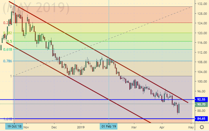 Сценарий роста: рассматриваем майский фьючерс, дата экспирации 20 мая. Как грубо. А где касание 84.65? Что ж… не будем торопиться с лонгами. Пусть рынок поднимется выше 93.00.