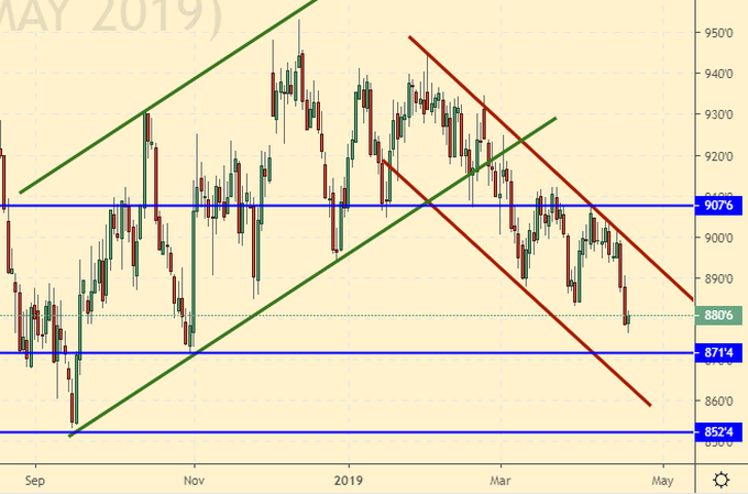Сценарий роста: рассматриваем майский фьючерс, дата экспирации 14 мая. Из-а африканской чумы свиней в Китае, выкосившей уже миллион голов, спрос на сою упадет в этом году. Действия трейдеров понятны. Мы уже давно смотрим вниз, что и продолжим делать в складывающихся обстоятельствах.