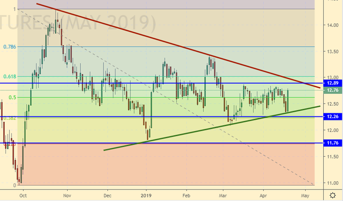 Сценарий роста: рассматриваем майский фьючерс, дата экспирации 30 апреля. Тут все банально. В случае роста выше 13.00 будем покупать. Развязка близка.