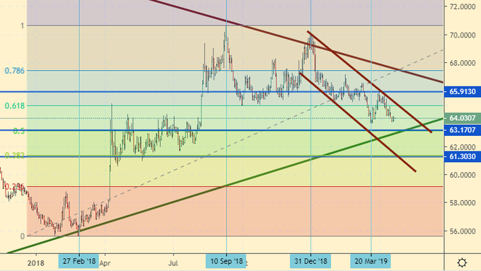 Сценарий падения: продолжаем считать, что перспектива увидеть 63.00 есть, а 62.00 уже нет. Исходя из этого можно что-то делать на «часовках». Глобальных продаж не совершаем, так как поддержка (зеленая линия) выглядит сильно. Она берет свое начало не в феврале 18-го года, а в июле 14-го еще от 34.13. Да, когда-то мы были все богаты.