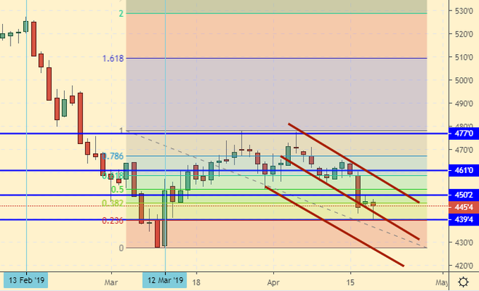 Сценарий роста: рассматриваем майский фьючерс, дата экспирации 14 мая. Основной вопрос на сегодня: 440.0 – это минимум или нет. Если быть осторожным, то надо ждать роста выше 460.0, но это 15 центов к текущему уровню. Покупаем здесь. Стоп: 438.0. Цель будет в районе 550.0.