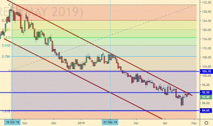 Сценарий роста: рассматриваем майский фьючерс, дата экспирации 20 мая. Ждем подъема рынка выше 93.30. Очень расстраивает не посещение нашей цели на 85.00. Просто очень. Завтра поеду на Wall Street и поразбиваю там мониторы. После роста выше 93.30 ждем для начала хода на 101.75.