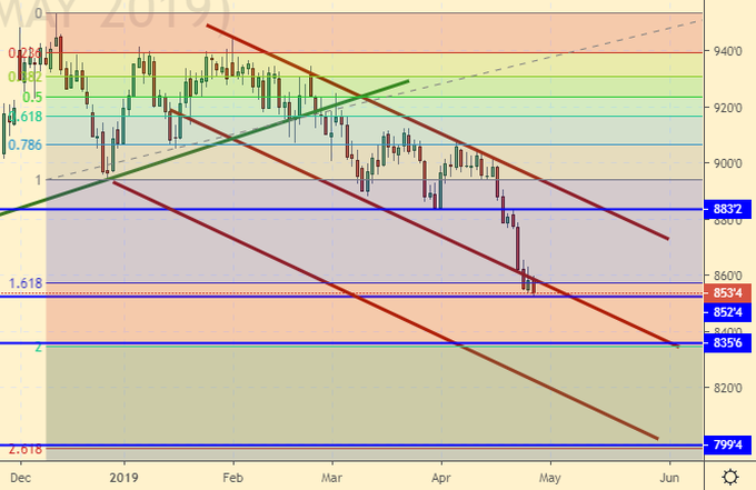Сценарий роста: рассматриваем майский фьючерс, дата экспирации 14 мая. Красиво летим. Рискуем пройти 850.0 даже не откатив наверх. Малазийский ринггит испытывает некоторые трудности. А это более дешевое пальмовое масло, а это уже давит на цену всех масличных. Не забываем чуму свиней в Китае. 800.0 это тот уровень, где можно думать о покупках.