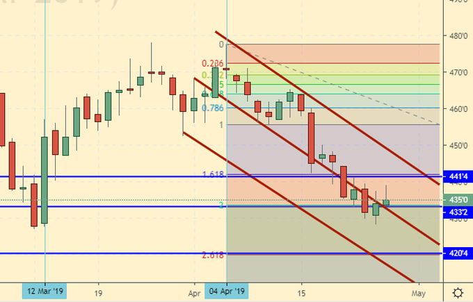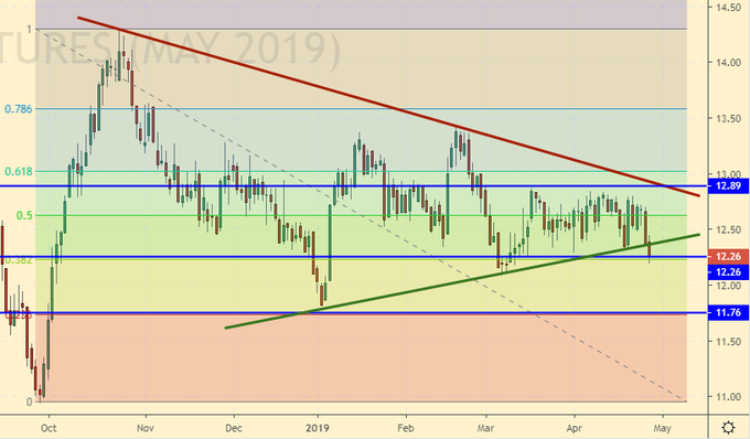 Существенных проблем с озимыми в Европе не наблюдается. В середине апреля состояние посевов было лучше средних показателей. Некоторый дефицит влаги наблюдался в Испании, Северной Италии и на Балканах, но для данных регионов данная ситуация типична. В России выжило минимум 75% озимых (они уже подкормлены), что можно признать хорошим показателем. Валюты Аргентины и Бразилии продолжают оставаться под давлением, что играет на руку медведям на рынке зерновых. Переговоры США и Китая буксуют. Видимо чиновникам с обеих сторон так понравилось получать премиальные за работу «в боевой нервной обстановке», что торопиться с решением обозначенной Трампом коллизии по дисбалансу в торговле они не будут.