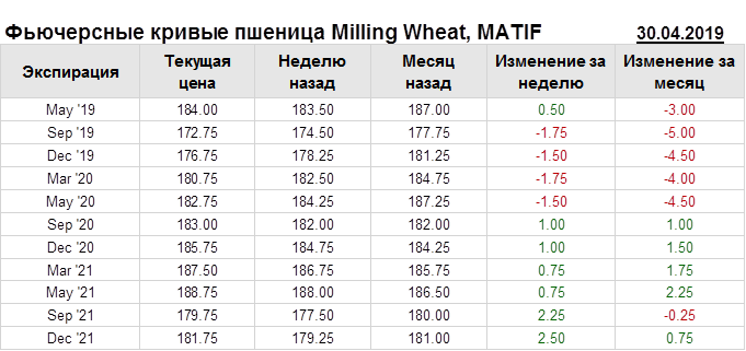 На 30.04.2019 стоимость пшеницы Milling Wheat на бирже MATIF по контракту May ’19 составила 184 евро за тонну. За прошедшую неделю стоимость пшеницы Milling Wheat выросла на 0.5 евро/тонна. Как мы видим на графике, фьючерсная кривая имеет периоды, когда более дальний фьючерс дешевле ближнего. Состояние бэквардации наблюдаем на следующих контрактах: Sep ’19, Sep ’21. Таким образом, трейдеры предполагают, что возможно превалирование предложения над спросом в указанные периоды.
