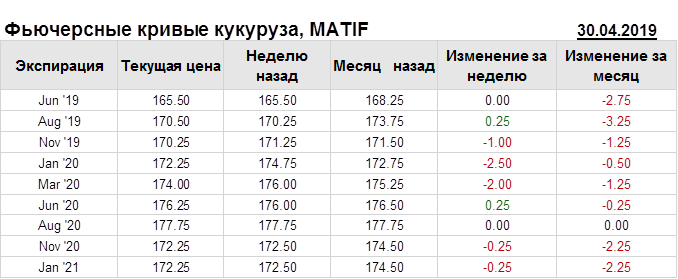 На 30.04.2019 стоимость кукурузы на бирже MATIF по контракту Jun ’19 составила 165.5 евро за тонну. За прошедшую неделю стоимость кукурузы на европейской площадке не изменилась. Как мы видим на графике, фьючерсная кривая имеет периоды, когда более дальний фьючерс дешевле ближнего. Состояние бэквардации наблюдаем на следующих контрактах: Nov ’19, Nov ’20. Таким образом, трейдеры предполагают, что возможно превалирование предложения над спросом в указанные периоды.