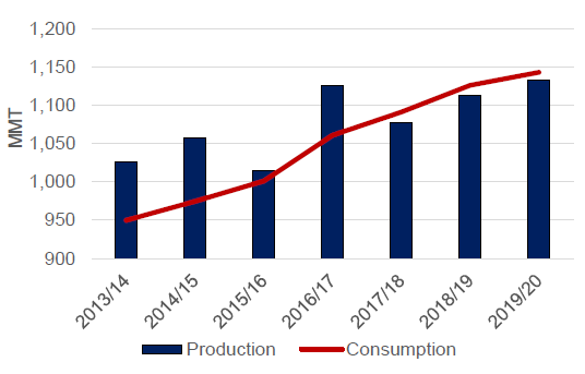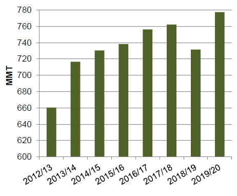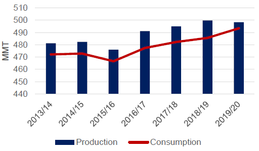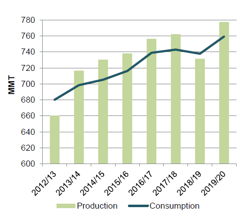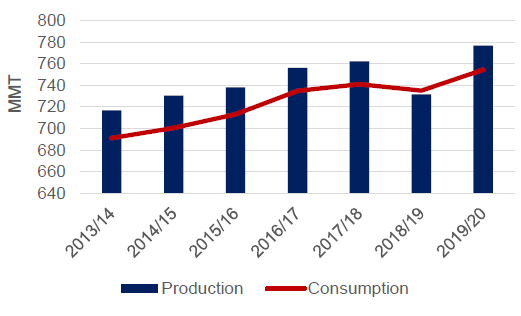 Мировое потребление прогнозируется на рекордном уровне в 2019/20 г., но его опередит рост производства. Это будет шестой раз за 7 лет, когда производство превысит потребление.
