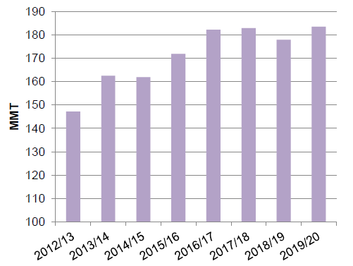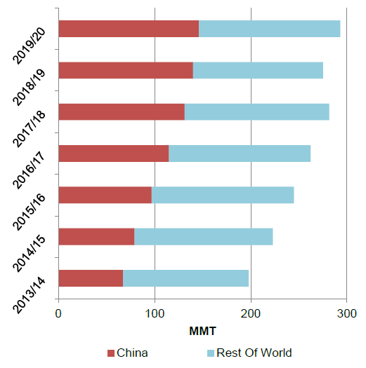 Прогноз мировых конечных запасов на 2019/20 год повышен примерно на 17 миллионов тонн по сравнению с предыдущим годом до 292 миллионов. На Китай, запасы которого повышены примерно на 6 миллионов тонн, по-прежнему приходится половина мировых запасов. Однако эти запасы, как правило, недоступны для мирового рынка.