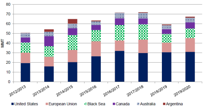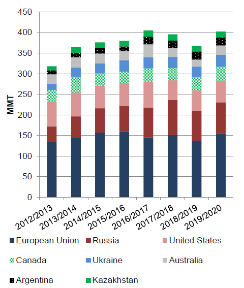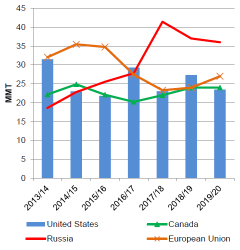 Даже при рекордном мировом спросе конкуренция за долю рынка будет интенсивной из-за обильных экспортных запасов. Прогнозируется, что российский экспорт снизится, но ожидается, что Россия останется ведущим мировым экспортером пшеницы с большим отрывом, при поддержке своего второго по величине урожая. Прогнозируется, что Европейский Союз станет вторым по величине экспортером, благодаря высокому урожаю. Согласно прогнозу, в Канаде ожидается увеличение производства и еще один год активного экспорта, что обеспечит прямую конкуренцию с пшеницей США на ключевых рынках Латинской Америки и Азии. Экспорт США значительно снизится, так как более крупные поставки конкурентов затруднят положение пшеницы США на рынках, чувствительных к ценам.