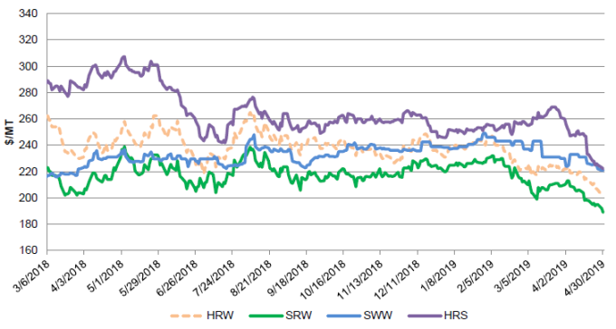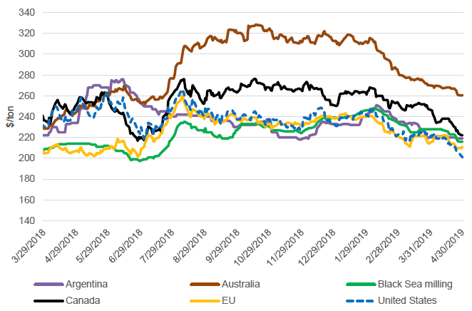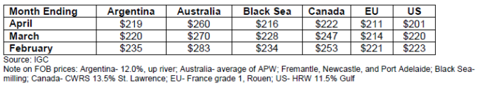 В апреле мировые котировки экспортеров в основном снижались на фоне сообщений о хорошем состоянии нового урожая в ключевых странах Северного полушария, особенно в Европейском союзе и России. Цены в Черноморском регионе упали на 12 долларов за тонну до 216 долларов, а цены в ЕС снизились на 3 доллара за тонну до 211 долларов. Пшеница в США упала на 19 долл. / т до 201 долл. из-за более слабых, чем ожидалось, темпов поставок и ожиданий обильных запасов конкурентов. В Канаде наблюдалось наибольшее падение цен — на 25 долл. США за тонну до 222 долл. США, на сообщениях об увеличении площади и, следовательно, об очень крупном урожае. Австралийские цены также снизились в течение месяца, но остаются высокими по сравнению с другими экспортерами.