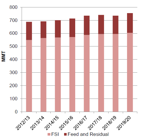 Потребление в качестве продуктов питания, семян и в промышленности (FSI) составляет основную часть потребления пшеницы и демонстрирует устойчивую тенденцию к росту. В 2019/20 году FSI прогнозируется на рекордном уровне, причем рост наблюдается почти во всех регионах. Рост особенно заметен в Южной Азии и Восточной Азии, что обусловлено ростом продовольственного потребления в Индии и Китае. Африка к югу от Сахары также демонстрирует значительный рост продовольственного потребления, основанный на быстром росте населения и меняющихся вкусах и предпочтениях. Потребители продолжают увеличивать количество пшеницы в рационе на фоне роста доходов и растущей урбанизации. Использование FSI в большинстве других регионов продолжает расти в основном за счет роста населения.