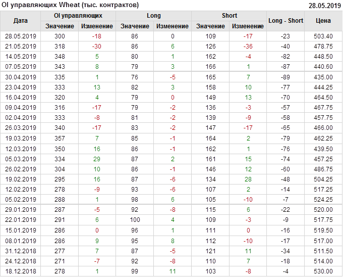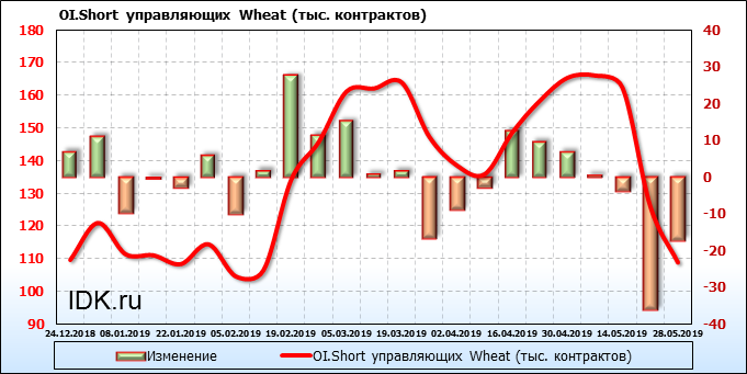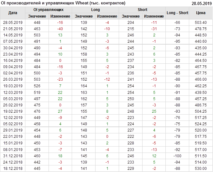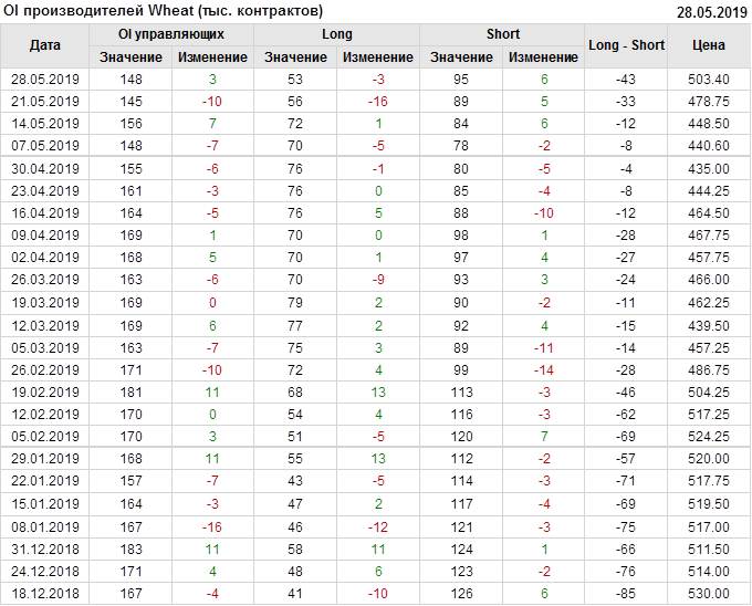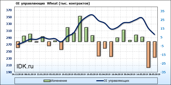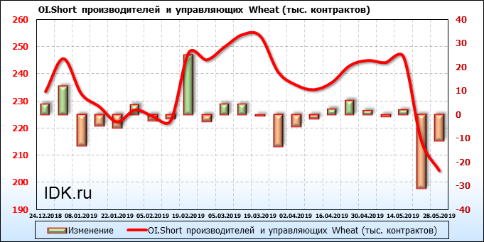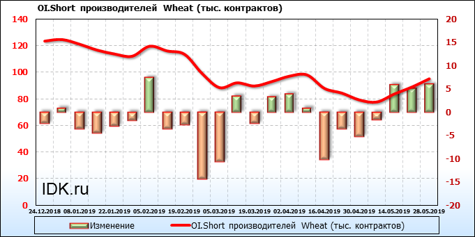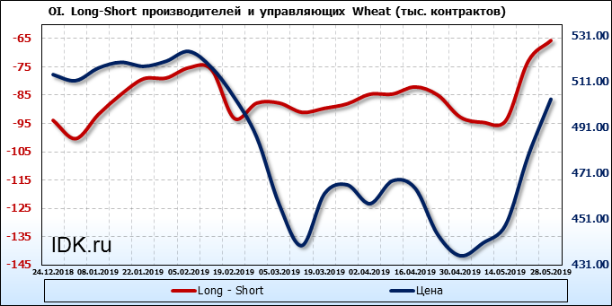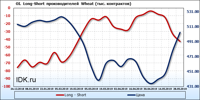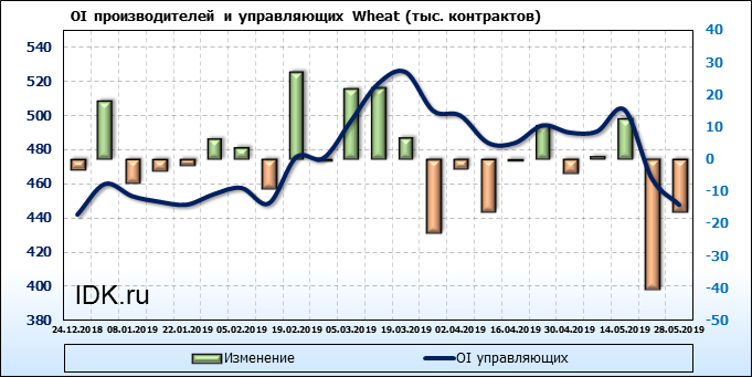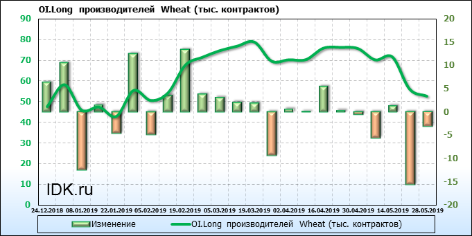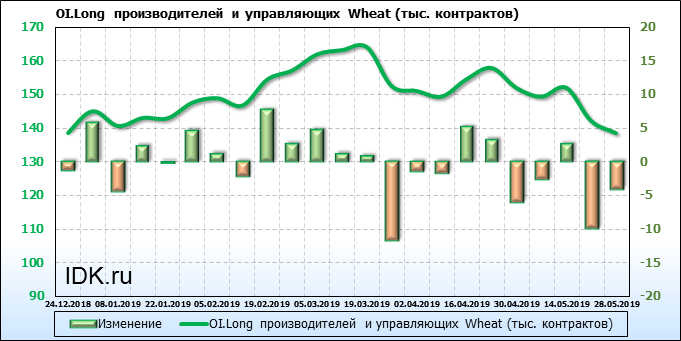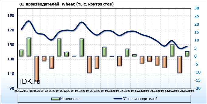 За прошлую неделю, 22.05.19 — 28.05.19, разница между длинными и короткими позициями производителей упала на 10 тыс. контрактов. В тоже время, цена выросла на 24.65 цента. Производители увеличивают продажи, предполагая, что текущие уровни являются привлекательными для них. И не смотря на это, рынок продолжает расти, что показывает силу текущего тренда.