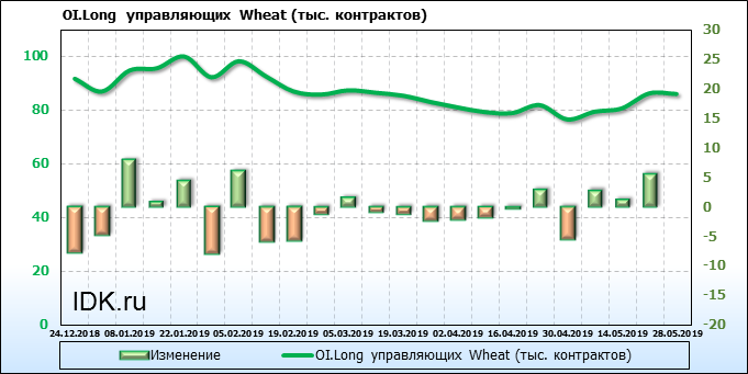 За прошлую неделю, 22.05.19 — 28.05.19, разница между длинными и короткими позициями управляющих выросла на 17 тыс. контрактов. В тоже время, цена выросла на 24.65 цента. Управляющие наращивают позиции, разгоняя тем самым рост цен, что говорит нам о текущей силе рынка.