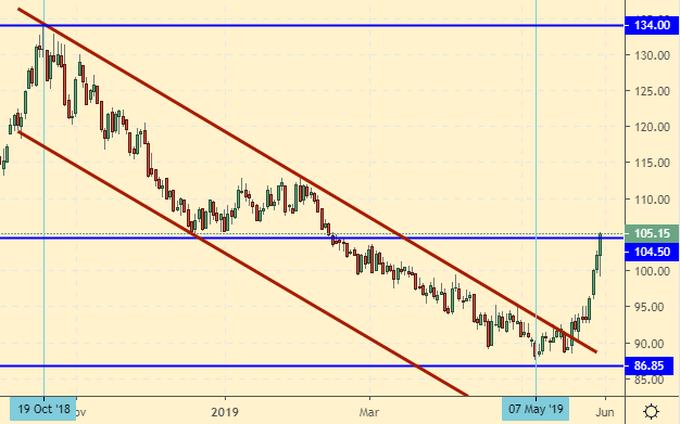 Сценарий роста: рассматриваем июльский фьючерс, дата экспирации 19 июля. Сделали цель на 104.0 и пошли выше. Несмотря на забранные деньги это нервирует. Ведь хочется еще и еще. Если рынок позволит, при откате к 96.0 купить.