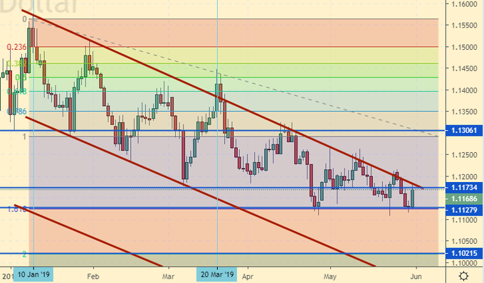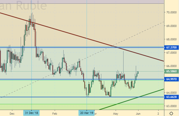 Тут не надо ходить к гадалке для того, чтобы понять, что при столь агрессивном падении цен на нефть рублю в понедельник и далее ничего хорошего не светит. Отъевшиеся и переставшие нервничать за последний год эффективные менеджеры прямо с 3 июня будут вынуждены надувать щеки и скрипеть портфелями. Мол, у нас все под контролем, мы непобедимы. Пока да, пока нефть не ушла под 40.00, можно рассчитывать (точнее, надеяться) на то, что мы останемся под уровнем 70.00 рублей за доллар. Ну, а реально, при кивке к 40.00 мы получим 75.00 очень быстро. То есть, вместе с падением цен на нефть сам доллар должен сильно страдать, например от мягкой политики ФРС. По рублю только шорт.