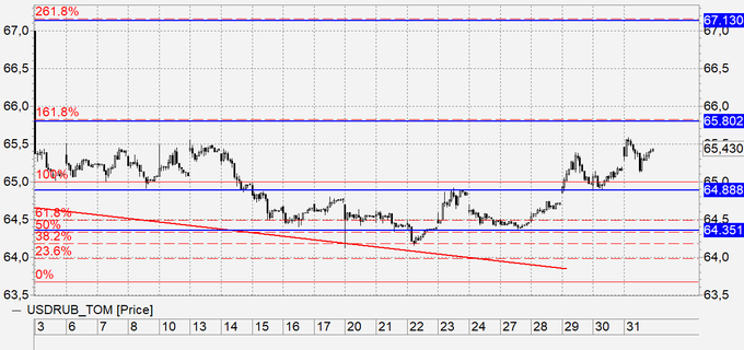 Рубль: вряд ли у кого-то есть сомнения в том, что сегодня рубль будет падать. Страхи по поводу возврата цен к 50.00 по Brent обязательно появятся на рынке, что выльется в пробой 65.80 с угрозой хода к 67.13.