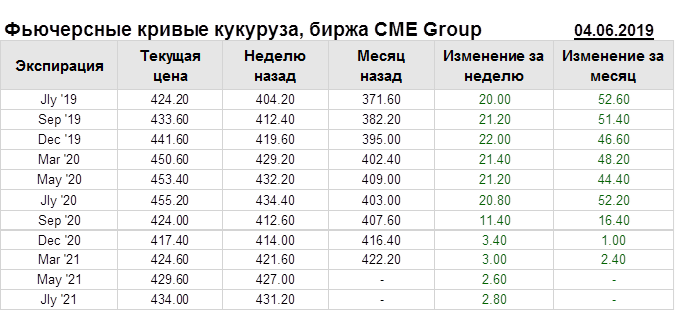 На 04.06.2019 стоимость кукурузы на бирже CME Group по контракту Jly ’19 составила 424.2 цента за бушель. За прошедшую неделю стоимость кукурузы на площадке CME Group выросла на 20 центов/бушель.
