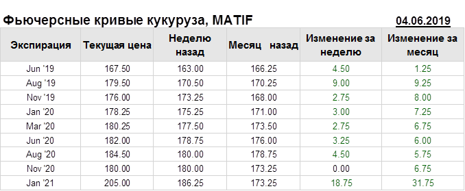 На 04.06.2019 стоимость кукурузы на бирже MATIF по контракту Jun ’19 составила 167.5 евро за тонну. За прошедшую неделю стоимость кукурузы на европейской площадке выросла на 4.5 евро/тонна. Как мы видим на графике, фьючерсная кривая имеет периоды, когда более дальний фьючерс дешевле ближнего. Состояние бэквардации наблюдаем на следующих контрактах: Nov ’19, Nov ’20. Таким образом, трейдеры предполагают, что возможно превалирование предложения над спросом в указанные периоды.