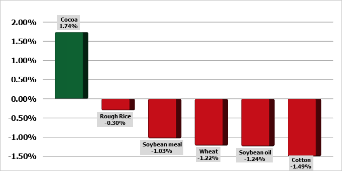 Цены на мукомольную пшеницу упали на бирже Euronext после того, как USDA сообщило, что посевы озимой пшеницы в США находятся в хорошем состоянии. В то же время евро укрепляется по отношению к доллару, что сдерживает рост цен, номинированных в европейской валюте. Жаркая погода в России также может повлиять на мировые цены. Агентство Agritel отмечает, что в районах производства озимой пшеницы в течение 15 дней дождей не ожидается. Это может снизить потенциал урожайности, что побудит некоторых аналитиков пересмотреть прогноз российского производства в сторону понижения.