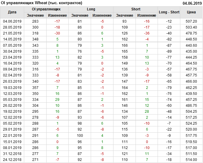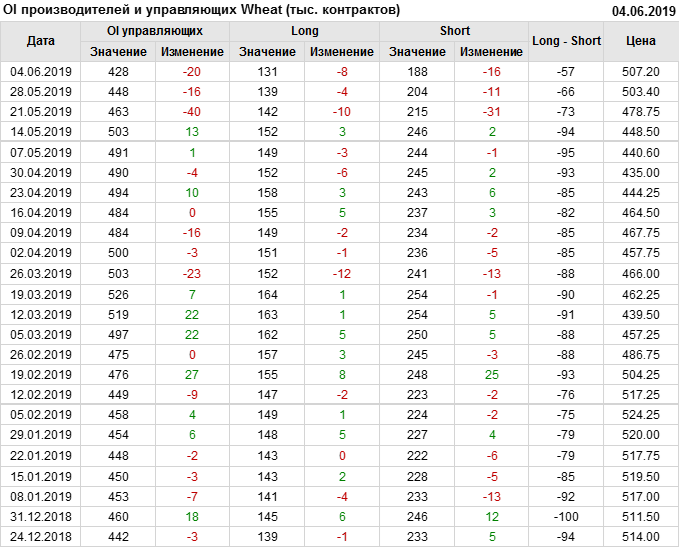 За прошлую неделю, 29.05.19 — 04.06.19, разница между длинными и короткими позициями управляющих выросла на 11 тыс. контрактов. В тоже время, цена выросла на 3.8 цента. Управляющие наращивают позиции, разгоняя тем самым рост цен, что говорит нам о текущей силе рынка.
