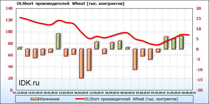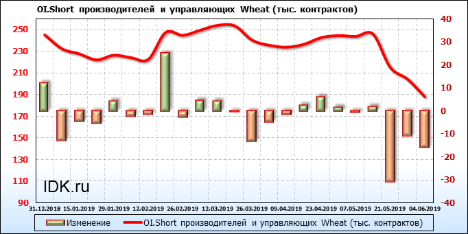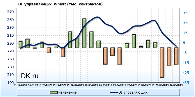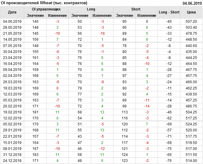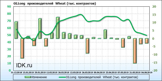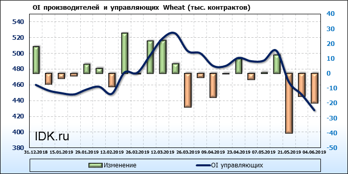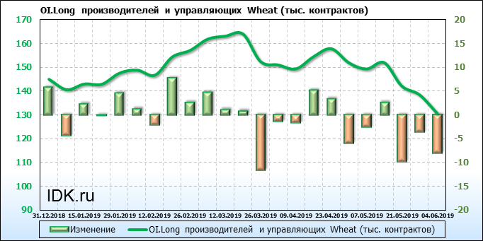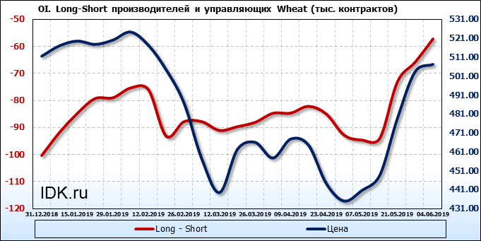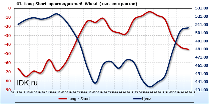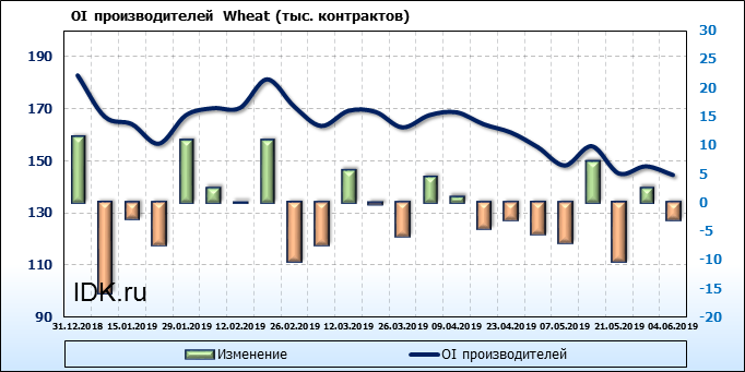 За прошлую неделю, 29.05.19 — 04.06.19, разница между длинными и короткими позициями производителей упала на 3 тыс. контрактов. В тоже время, цена выросла на 3.8 цента. Производители увеличивают продажи, предполагая, что текущие уровни являются привлекательными для них. И не смотря на это, рынок продолжает расти, что показывает силу текущего тренда.