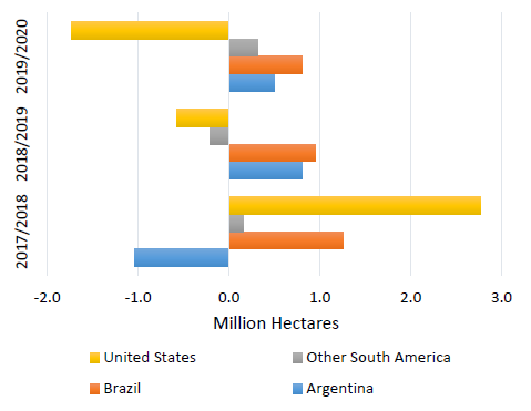 Прогнозируется, что мировое производство сои в 2019/20 году достигнет 355,4 млн. тонн, что на 6,7 млн. тонн ниже оценки производства для 2018/19 года. Это снижение в первую очередь отражает сокращение посевных площадей и возврат к трендовой урожайности в США. Сокращение площади связано с низкими ценами, большими переходящими остатками, погодными проблемами и неопределенностью в отношении торговли с Китаем. Ожидается увеличение производства в Бразилии, Китае, Парагвае и Индии в общей сложности на 8,7 млн. тонн по причине увеличения уборочной площади. Несмотря на сокращение площади в Соединенных Штатах, уборочная площадь в мире, согласно прогнозу, увеличится почти на 1 процент до рекордных 126,7 млн. га.