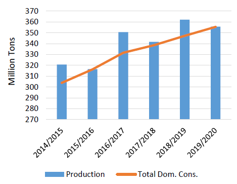 Мировое производство хлопчатника в 2019/20 г. прогнозируется на уровне 45,9 млн. тонн, что почти на 1 процент больше, в соответствии с расширением посевов. Увеличение производства в Соединенных Штатах, крупнейшее с 2006 года, и восстановление урожая в Индии являются основными факторами, компенсирующими снижение производства в Бразилии, Аргентине и Австралии. Поскольку на долю торговли приходится менее 2 процентов производства, изменения потребления будут отражать производство и увеличение потребления в Соединенных Штатах и Индии. Прогнозируется, что объем мировой переработки вырастет на 3 процента с соответствующим увеличением запасов шрота и масла. Прогнозируется, что глобальные конечные остатки сократятся на 8 процентов, что приведет к снижению переходящих запасов до более комфортного уровня.