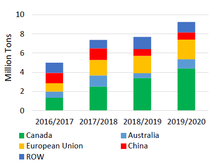 o Канада — экспорт рапса прогнозируется на 500 000 тонн ниже на уровне 10,1 млн. тонн, экспорт шрота немного повышен до 4,8 млн. тонн, а экспорт масла почти не изменится и составит 3,3 млн. тонн.