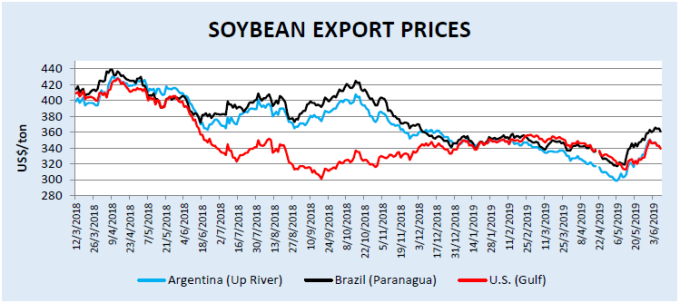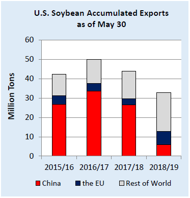 За неделю, закончившуюся 30 мая 2019 г., обязательства США по экспорту сои в 2018/19 г. (отложенные продажи плюс накопленный экспорт) в Китай составили 13,6 млн. тонн против 28,7 млн. год назад. Общий объем обязательств перед миром составил 46,7 млн тонн по сравнению с 55,6 млн за аналогичный период прошлого года. Накопленный экспорт сои составил 34,9 млн тонн, что на 11,7 млн тонн меньше, чем в прошлом году. Накопленный экспорт сои в Китай составил 6,9 млн. тонн, что более чем на 20 млн. тонн меньше, чем в прошлом году. Поставки в другие страны мира составили 21,0 млн тонн, что на 5,1 млн тонн больше, чем за тот же период прошлого года.